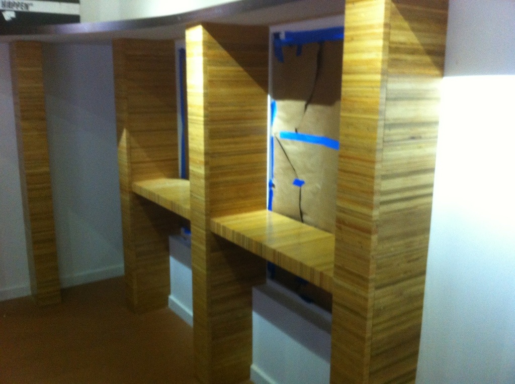 So this is a coffee bar area at division one bike shop in Austin Texas. I encapsulated four columns and built the bar tops all out of my reclaimed plywood material. Finished with waterlox/poly combo.