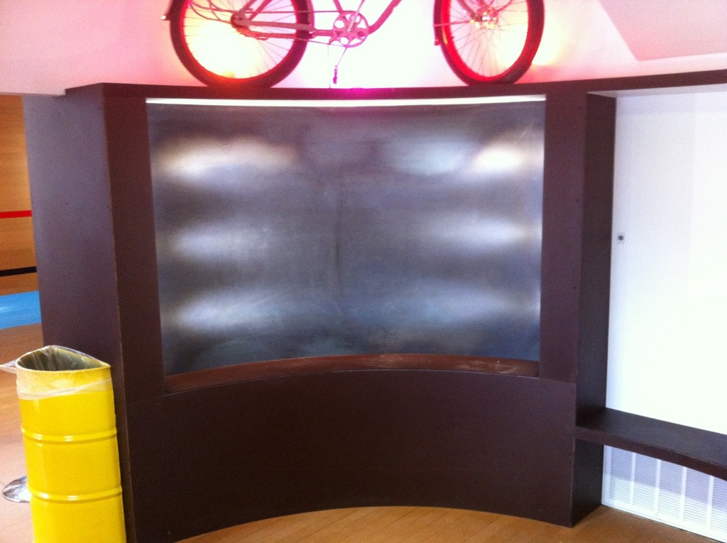 So big project building curved displays. Made out of a ramp material called skate lite. Curved top plate circles the room and ends up at my reclaimed coffee bar.