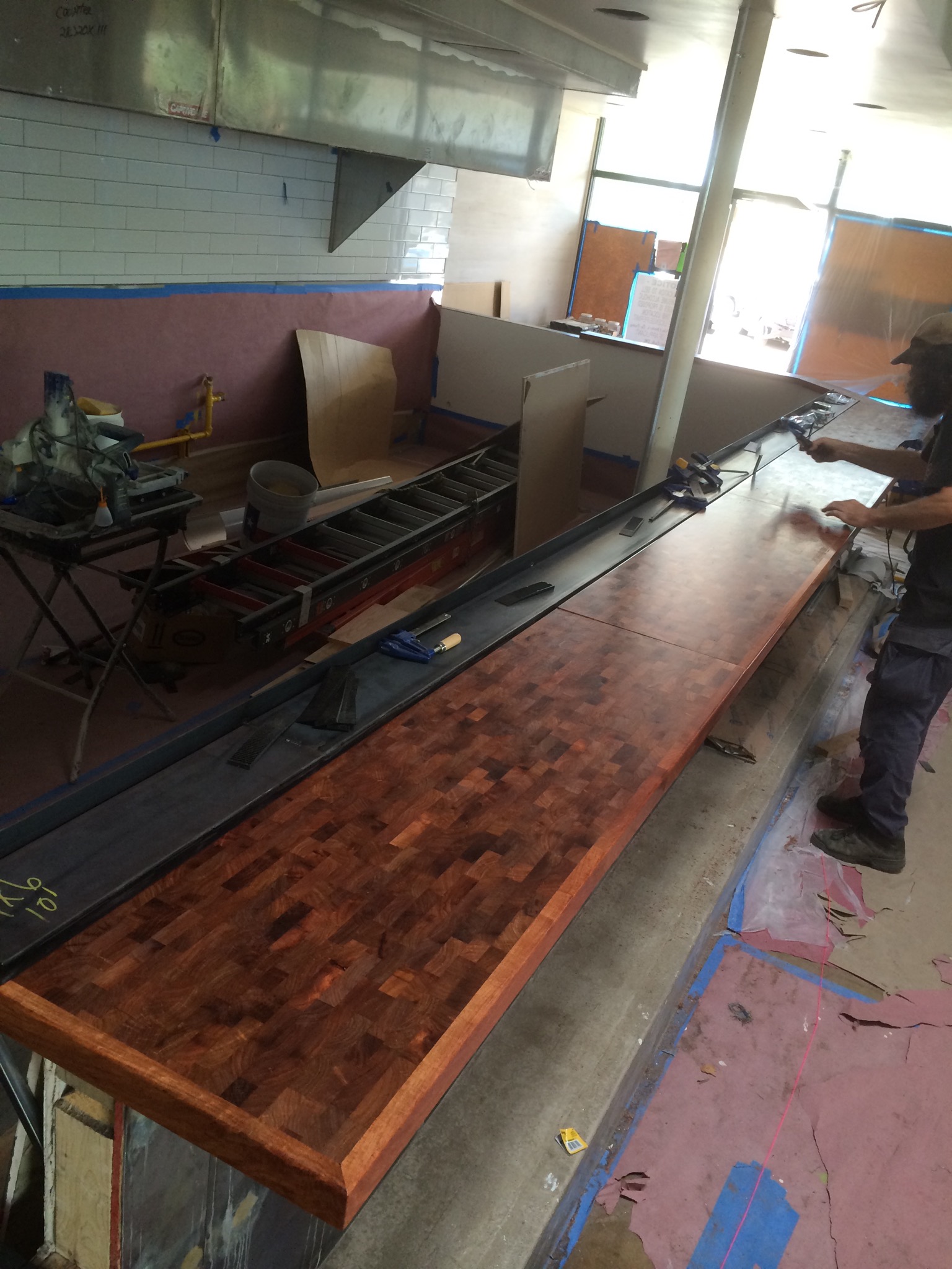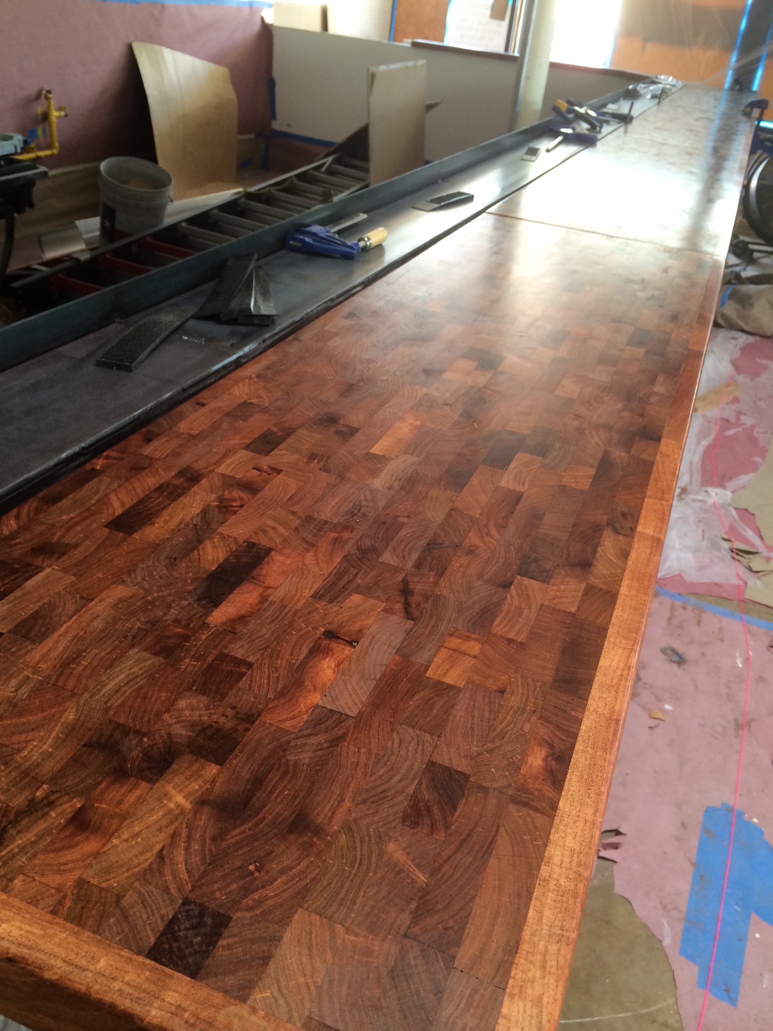 Counter cafe mesquite counter Posted on March 16, 2015 by bennetthaus Reply All Endgrain mesquite counter with poly finish. Over 21 feet with end caps.